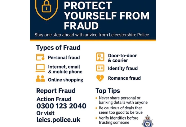 🔐 Types of Fraud & How to Protect Yourself1. Personal FraudFraudsters may contact you via email, text, phone, or in person to steal money or personal information. Leicestershire Police offers 10 golden rules to prevent fraud, such as: Read more [leics.police.uk] Includes phishing, malware, and scam messages. Key advice: Learn more [leics.police.uk] Fraudsters may set up fake websites or listings. Tips: Explore advice [leics.police.uk] Scammers may pose as officials or couriers to steal money or cards. Common tactics: Full details [leics.police.uk] Involves stealing personal data to open accounts or commit crimes. Prevention includes: More info [leics.police.uk] Scammers build fake relationships to exploit victims emotionally and financially. Warning signs: Read the full guide [leics.police.uk] 📞 Reporting Fraud