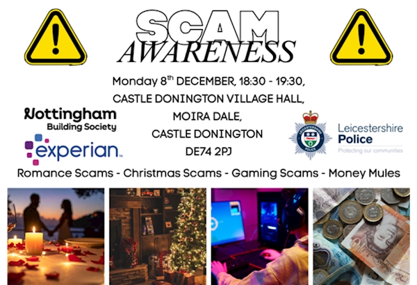 Dear All, # SCAM AWARENESS EVENT 8Th DECEMBER CASTLE DONINGTON VILLAGE HALL 57 MOIRA DALE CASTLE DONINGTON DE74 2PJ FROM 18:30-19:30 SPECIALIST ADVICE AND GUIDANCE FROM NOTTINGHAM BUILDING SOCIETY FRAUD MANAGER, EXPERION AND YOUR LOCAL POLICE TEAM. WE WILL HIGHLIGHT 4 SCAM AREAS :> ROMANCE - CHRISTMAS -GAMING AND MONEY MULES.