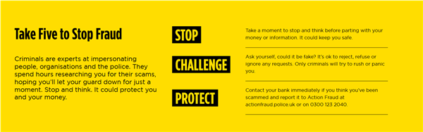 For advice on how to avoid fraud visit Take Five To Stop Fraud | To Stop Fraud