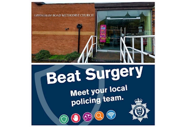 A member of your local Neighbourhood Policing Team will be at Uppingham Road Methodist Church, 178 Uppingham Road, Leicester, LE5 0QG on Friday 19th December 2025 between 10:00am and 11:00am.