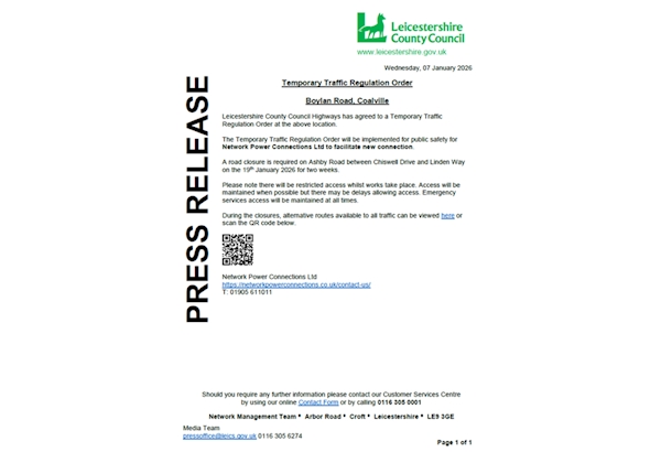 Please be aware that Boylan Road, Coalville will be closed from 19th January for approximately 2 weeks due to urgent works taking place.