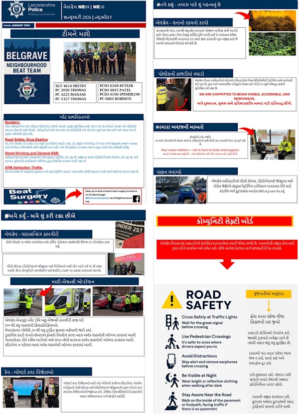 📢 અમારું જાન્યુઆરી 2026 ન્યૂઝલેટર હવે લાઇવ છે! તમારી બેલગ્રેવ નેબરહુડ ટીમે પુષ્કળ પ્રવૃત્તિ સાથે વર્ષની શરૂઆત કરી છે - અને આ મહિનાના અપડેટમાં બધું સમાપ્ત થઈ ગયું છે.🙌 ✔ સ્થાનિક પોલીસિંગ હાઇલાઇટ્સ ✔ સમુદાય જોડાણ ✔ આગામી ઇવેન્ટ્સ અને પ્રાથમિકતાઓ જેમ જેમ અમે રાહદારીઓ સંબંધિત વધુ ઘટનાઓ જોયા છે, અમે ઉપયોગી સલામતી સલાહ અને ટોચની ટિપ્સ સાથે અમારા સમુદાય સલામતી બોર્ડ 🛑 ને તાજું કર્યું છે. સતર્ક રહો, સુરક્ષિત રહો 👥💛 PCSO જોશુઆ (6196) બેલગ્રેવ નેબરહુડ પોલીસિંગ ટીમ લેસ્ટરશાયર પોલીસ