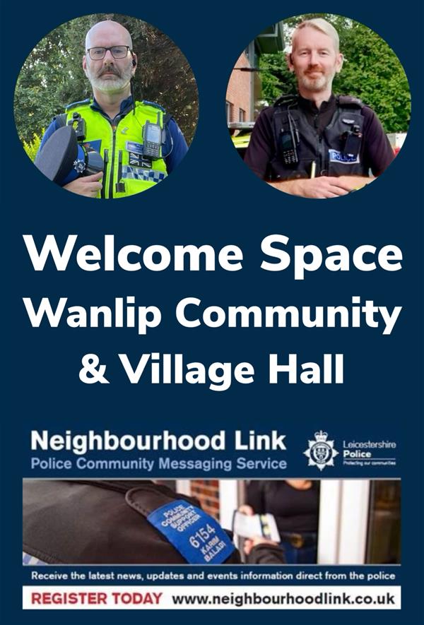 PC 1947 Dave BENNETT & PCSO 6174 Jon HARRISON will be paying a visit to the Wanlip Church & Village Community Hall Welcome Space on Friday the 17th April 2026 between 2pm and 3pm and will be available to discuss any queries, questions or concerns local residents may have.